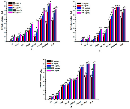 The cytotoxicities of chitosan, chitosan derivatives, and chitosan nanoparticles on MCF-7 (a), BGC-823 (b), and HEPG-2 cells (c). Data are presented as mean value ± SD. Letters that are different in Figure 8, according to various sample concentrations, differ statistically between different samples (p < 0.05).