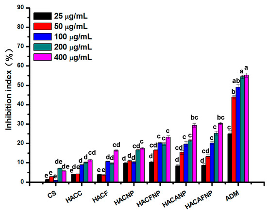 Meanwhile, the cytotoxicity assay of tested samples on normal HTR-8 cells was investigated to explore the biocompatibility of nanomaterials. In general, compounds are considered nontoxic or low in toxicity when the cell inhibition rate is less than 20%. From Figure 9, the inhibitory effects on HTR-8 cells treated with CS were about 0–10% at all tested concentrations. Meanwhile, the inhibitory effect of blank nanomaterials without ADM was low and the inhibitory index was about 10–22%. However, the inhibitory effect of free ADM on normal HTR-8 cells was significantly higher, and the inhibitory index exceeded 57% when the tested concentration was 400 μg/mL. In other word, free ADM is more toxic to normal cells. Fortunately, after the loading of ADM on chitosan nanomaterials, there is a remarkable reduction in the inhibitory index at different tested sample concentrations. Taking HACAFNP as an example, when the tested concentration was 400 μg/mL, the inhibitory index was 29.37%. Therefore, chitosan nanomaterials could be considered as practical biomaterials with dramatically enhanced biological activity and reduced cytotoxicity for drug loading/release in a delivery system instead of traditional drug delivery systems.