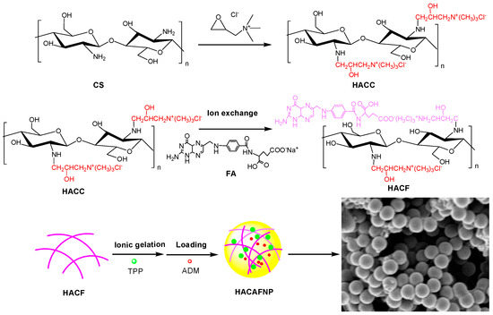 Chitosan, a polysaccharide of cationic β-(1→4)-2-amino-2-deoxy-D-glucan, is prepared commercially by partial chemical deacetylation of chitin in the alkaline reaction system [11,12,13,14]. As a kind of marine active substance, chitosan has drawn attention in biomedical and biotechnological fields since it possesses excellent biological properties, including biocompatibility, non-toxicity, biodegradability, antioxidant activity, antimicrobial activity, and so on [15,16]. Therefore, it has been reported that chitosan nanoparticles can be served as practical drug carriers with the advantage of a controlled and slow drug release, which can reduce toxic and adverse effects and enhance the efficacy of chemotherapy [9,17]. Iurciuc-Tincu et al. developed novel, high drug-loaded complex microparticles through ionic cross-linking and polyelectrolyte complexation. The results showed that the microparticles, administered orally, can be used to target the colon for controlled release of curcumin [18]. Rata et al. investigated a kind of nanocapsule based on carboxymethyl chitosan bearing AS 1411 aptamer and poly (N-vinylpyrrolidone-alt-itaconic anhydride) loading 5-fluorouracil. The nanocapsules loading 5-fluorouracil were proved to be able to induce cell senescence and apoptosis MCF-7 cells [19]. Guilherme and Breno reported on a kind of chitosan nanoparticle loading oxaliplatin, which was used as a mucoadhesive topical treatment of oral tumors [20]. They found that these kinds of chitosan nanoparticles loading oxaliplatin cause a drug burst effect at first, followed by a longer-term controlled release. The chitosan nanoparticles formulation enhanced threefold the drug utilization. Meanwhile, it is critical for polysaccharides as nanomaterials with good biological activity to avoid infection and immunoreaction [21,22]. Since 2-hydroxypropyltrimethyl ammonium chloride chitosan (HACC) is more soluble and active than chitosan but has the same physical and chemical properties, it may be used as a drug carrier with good antioxidant activity to synthesize an efficient controlled drug release system [17]. In addition, folic acid, also known as vitamin B9, has reported to be a water-soluble vitamin with high antioxidant activity and low immunogenicity [23,24]. It is highly expressed in cancer cells due to its highly specific affinity with folate receptors [25]. Therefore, we hypothesize that nanoparticles loading ADM based on HACC grafting folic acid could be a practical drug carrier with the advantages of slow and controlled drug release, enhanced antioxidant activity, antitumor activity, and reduced toxicity.