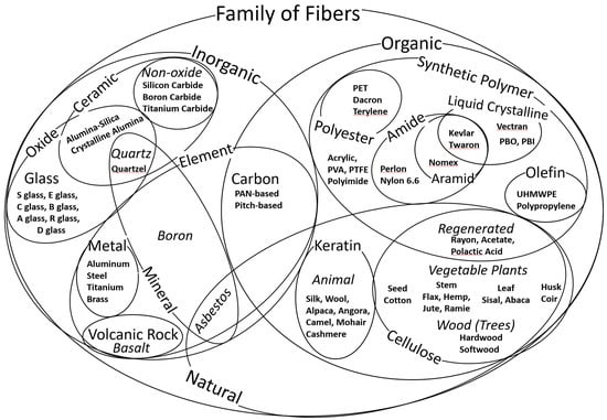 There are many methods to classify and categorize fibers for comparison. The textile institute publishes a diagram of textile fiber types which separates fibers into natural and man-made categories [8]. Since there are additional nontextile fibers that may be appropriate for additive manufacturing, the generic phrase “family of fibers” is used throughout this review to encompass all categories of fibers. A classification for the global family of fibers using organic and inorganic categories as the initial delineation is shown in Figure 1 below and Table A1 in Appendix A.