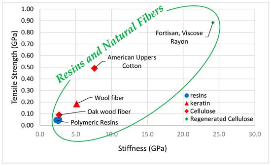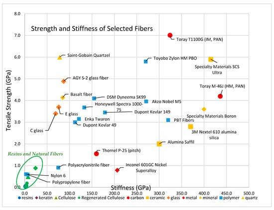 Figure 2 graphs the tensile strength and tensile stiffness of common polymeric resins. All natural fibers surveyed are stronger and stiffer than the example resin materials.
