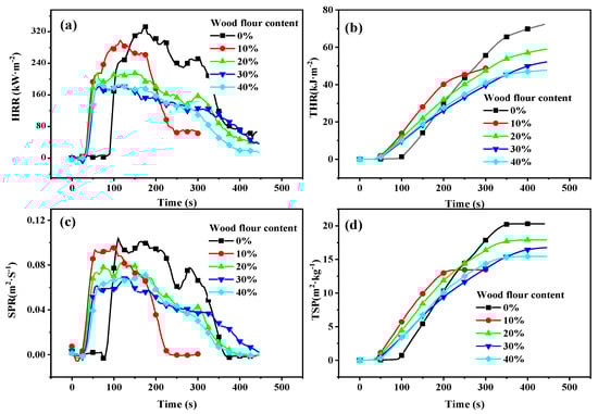 Heat rate release (HRR) (a), total heat release (THR); (b), smoke production rate (SPR); (c), total smoke production (TSP); (d), and curves of wood-PC composites.