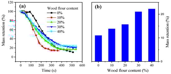 Mass retention curves of wood flour/PC composites (a) and the mass residue of the resulting composites at 500 s (b).
