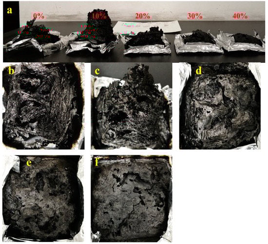 (a) Digital photos of char formation for wood–PC composites after cone calorimeter and the surface morphology of char formed from the resulting composites with different wood contents: (b) 0%; (c) 10%; (d) 20%, (e) 30% and (f) 40%.
