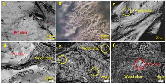 Micromorphology of char formation for wood–PC composites with different wood flour contents after vertical burning test: (a,b) 0%, (c) 10%, (d) 20%, (e) 30%, and (f) 40%.