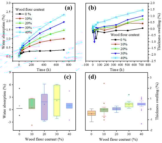 Figure 5 shows that the water absorption and the thickness swelling of the wood flour/PC composites increased with time and increased wood flour content. The water absorption of composites with 40% wood flour content is about 5.3 times more than pure PC. The wood flour has many free hydroxyl groups on its surface, leading to water absorption [39]. However, the hydrophobic PC matrix is considered the nonabsorbent part of the biocomposites. When immersing the biocomposites in water, the free hydroxyl groups of wood flour formed hydrogen bonds with water molecules [40]. An increasing number of hydroxyl groups of wood flour appeared on the surface of the biocomposites with increasing wood flour content, increasing water uptake. The previous literature reported a similar phenomenon for both wood polypropylene composites and wood HDPE composites [41,42]. For the two-hour boiling water test, the water absorption of the biocomposites did not change obviously with increasing wood flour content. This indicates the excellent hydrothermal stability of the composites. Moreover, the trend of the thickness swelling of the biocomposites in the boiling water test was similar to that in the water absorption test at room temperature. Upon immersion, wood flour on the surface of composites uptakes water and swell; then, the water is transferred from one cell to another over time [39].
