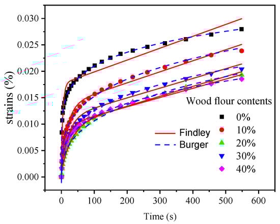 Creep is an important property for composites since it is indicative of the potential structural applications. Wood content, polymer nature, wood particle size, test time, temperature, applied stress, and humidity influence the creep behavior of biocomposites. Generally, the creep behavior is more severe for biocomposites than for wood due to the nature of polymers [43]. In the current study, the creep strain of the wood–PC composites decreased with higher wood flour content (Figure 6), in good agreement with previous findings for wood–polypropylene composites [44]. The reason for this may be that wood flour restricted the stretching, bending, and slipping of PC molecular chains, which is in good agreement with the modulus results of the composites [18]. Furthermore, the rigidity of wood flour is higher than that of pure PC plastic, which increases the anti-creep property of the resulting wood flour-PC composites [40,45].