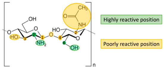 Chemical structure of chitosan. Highly reactive positions are highlighted in green, poorly reactive position are highlighted in yellow.