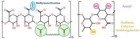 Pectins are weak polyanionic heteropolysaccharides found in the cell walls of land plants, and are frequently obtained from fruit such as apple or citrus peel. They are also present in green algae. Structurally, three pectic polysaccharides have been isolated from primary cell walls. Homogalacturonan is composed of a chain of α-(1→4)-D-galacturonic acid (GalpA) (≥65%). The carboxyl groups in C-6 can be partially methylesterified and the free acid groups may be partly or fully neutralized with sodium, potassium or ammonium ions. Pectins may also be O-acetylated on C-2 or C-3 [45,46]. Rhamnogalacutonan-I is a backbone of GalpA and rhamnopyranosyl (Rhap) in the repeating dissacharide [→4)α-D-GalpA-(1,2)-α-L-Rhap-(1→] which represents 20–35% of pectin. The backbone residues of GalpA may be O-acetylated on C-2 and/or C-3. Rhap residues are substituted at C-4 with neutral and acidic oligosaccharide side chains such as arabinose and galactose, forming arabinan, galactan and arabinogalactans in the side chains. Other less frequent residues may also be present, as well as ferulic or coumaric acid (Figure 3) [46,47,48]. Finally, rhamnogalacturonan-II is the most structurally complex pectic domain, and represents 10% of pectin. Its structure is widely conserved across plant species and consists of a highly branched homogalacturonan backbone. The side chains contain 11 rare sugars in over 20 different linkages. Rhamnogalacturonan-II is usually found in plant walls as homodimers crosslinked by a 1:2 boratediol ester [48,49].
