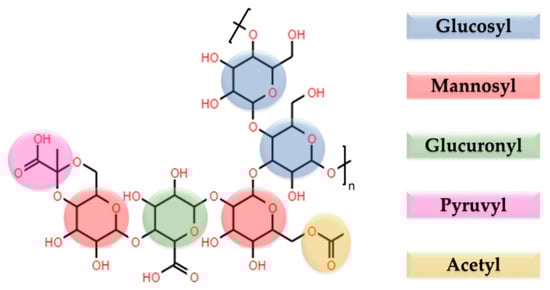 Xanthan gum is a highly hydrophilic natural heteropolysaccharide produced by the bacteria Xanthomonas campestris. It is a branched polymer with high molecular weight in the range of 2000 KDa to 20,000 KDa. Its primary structure is a repetitive pentasaccharide: the backbone is a linear (1 → 4)‒linked‒D‒glucose, with a trisaccharidic side chain containing varying proportions of acetyl and/or pyruvyl on the mannose residues, with a varying degree of substitution (Figure 4). Due to the pyruvyl residues, xanthan gum is a natural anionic PE with a pKa = 3.1, which makes it a suitable candidate for the development of PEC-based devices [51,52,53].