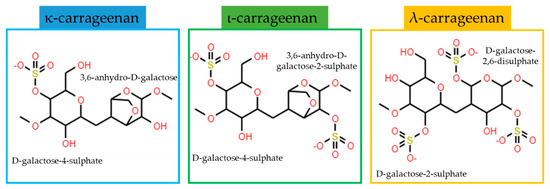 Carrageenan is a group of sulphated natural polyanions obtained from red algae. The interest in these polymers lies in their structural diversity and unique physical properties. They are water-soluble linear polysaccharides composed of repeating disaccharide units with alternating 3-linked β−D-galactopyranose and 4-linked α-galactopyranose or 3,6-anhydro-α-galactopyranose with an average molecular weight of between 100 and 1000 KDa. The structural diversity of CG is due to the location and percentage of the sulphate groups (15–40%) or the presence of 3,6-anhydro-D-galactose [66,67]. At least 15 different carrageenan structures are known today, with varying chemical structures and degrees of sulphation. However, three types of carrageenan are most important to industry: κappa (κ), ιota (ι) and lambda (λ) carrageenan (Figure 5) [68].