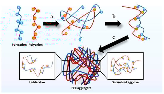 The mechanism of PEC formation can be summarized in three main steps: the first, which occurs immediately, is the establishment of secondary binding forces after mixing oppositely charged PE solutions; the second involves the formation of new bonds and/or the correction of the distortions of the polymer chains, leading to a new conformation; and the last is the aggregation of the complexes formed through hydrophobic interactions, which are generally insoluble in the medium [80,81]. It has been suggested that the complexation process may result in a ladder-like or scrambled-egg-like PEC. Ladder-like PECs are formed by hydrophilic single-stranded and hydrophobic double-stranded parts. These phenomena are the result of mixing PEs with weak ionic groups and large differences in the size of their molecules, which produces higher viscosity and an electromagnetic shielding effect compared to the constituent PEs. In contrast, due to precipitation by aggregation, scrambled-egg-like PECs exhibit lower viscosity than their constituent PEs [81,82]. However, considering their mechanism of formation, PECs can be regarded as a combination of both with different ratios depending on the characteristics of the polyions [80] (Figure 7).