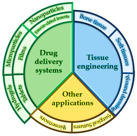 Many biopolymer-based healthcare materials have recently been explored, such as drug delivery designs; some of them have already been approved for clinical use, and biopolymers are widely employed as excipients in the pharmaceutical industry [2]. Furthermore, most of the natural polymers are mucoadhesive, which makes them interesting candidates for the development of drug delivery systems intended for the sustained release of drugs in the different mucous membranes (i.e., ocular, nasal, buccal or vaginal) [3]. Moreover, biopolymers have proven capable of biomimicking the native extracellular matrix and a judicious choice of the processing method may enhance this feature. Accordingly, different techniques, such as electrospinning or 3D printing, are presently being explored for the manufacture of biopolymer-based healthcare materials, including wound dressings or scaffolds for tissue engineering [4,5,6]. Furthermore, biopolymers have been used as coating agents in tissue engineering with numerous advantages, such as the improvement of osteogenic expression or the inhibition of biofilm formation while providing anti-inflammatory effects. Interestingly enough, these coatings can be loaded with drugs and nanoparticles, acting as drug delivery systems [7]. Pectin or chitosan are some representatives of this application for biopolymers [8,9].