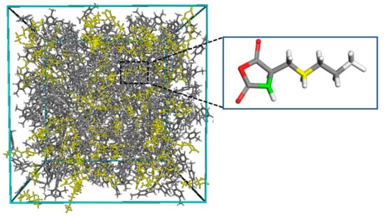First, the double bonds in maleic anhydride and 1-pentene (cyclopentene) were changed to single bonds and linked to form a composite monomer, as shown in Figure 3. Then a three-dimensional periodic boundary cubic box composed of 200 composite monomers (the yellow part in Figure 4) and 1000 p-xylene molecules (a non-polar solvent) were constructed in the Amorphous Cell modules of Materials studio 7.0 software pack. The density was set to be 0.86 g/cm3 (measured in the experiment). The cell size was 64.7 Å × 64.7 Å × 64.7 Å. Two nanoseconds of NVT dynamic equilibrium was employed to the cell. The integration time step was 1 fs, the temperature T = 500 K, and the COMPASS force field was adopted, which was validated on alkane and phenyl liquid substances in the literature by Sun []. The temperature-control method adopted the Nose method to fully relax the system at a high temperature.