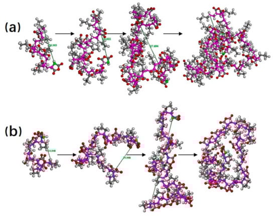 The molecular conformation evolution of 1-pentene–maleic anhydride (1PM) in the acetone as a solvent (a) and ethyl acetate as a solvent (b). The green atom is the active center, and degree of polymerization (DP) is 20 and 30 from left to right, respectively.