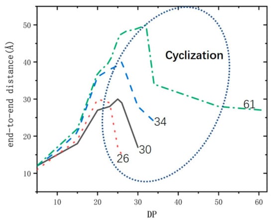 To study the distribution of molecular weight, more polymer chains with different molecular weights are needed. Due to the randomness of constructing cells in the AC module, we can obtain a new chain of 1PM when the initiation–growth–termination process was repeated. Repeat this process until 26 chains were simulated. Thus, we obtained a total of 26 polymer chains of 1PM as statistical samples. By the same method, we obtained 26 polymer chains of CPM. It was found that these chains all had the characteristics of intra-chain cyclization (see Figure 7) and active center being wrapped. When the active centers of the chains were wrapped earlier, the molecular weight of the polymers was relatively low, and when the active centers of chains were wrapped later, the molecular weight of the polymers was relatively high. It can be seen from Table 2 that the DP number of the copolymer 1PM ranges from 26 to 80, and the largest number of molecular chains (Ni) is 8 when the DP is 30. The DP of CPM ranges from 17 to 60, and the distribution of CPM ranges narrowly than that of 1PM. The highest Ni of CPM reaches 7 when the DP is 23. Based on the above analysis, the DP of CPM is smaller than that of 1PM. The copolymer chains of CPM have a greater tendency to cyclize than 1PM chain, so the chain termination of CPM occurs at a smaller degree of polymerization.