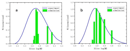 (a) Simulation and experimental molecular weight distribution of copolymer 1-pentene–maleic anhydride (1PM); (b) simulation and experimental molecular weight distribution of copolymer cyclopentene–maleic anhydride (CPM); the results were normalized to 1 for comparison.