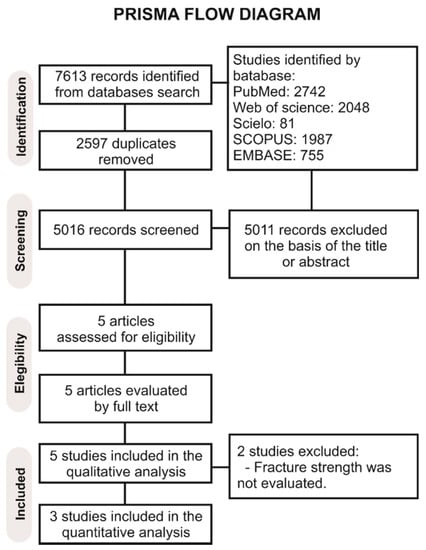Two reviewers (R.B. and L.H.) independently assessed the titles and abstracts of all manuscripts. Papers were selected for full-text review according to the following inclusion criteria: (1) in vitro studies evaluating the effect of the use of composite core materials on the fracture resistance of endodontically treated teeth; (2) included a control group in which bulk-fill or conventional composite resin was applied following the manufacturers’ instructions; (3) included a group where core build-up composite resin was used; (4) evaluated the fracture resistance of endodontically treated teeth restored with composite resins and core build-up composite resins; (5) included mean and standard deviation data in N. Only studies written in the English language were considered for this review. Papers that involved endodontically treated bovine teeth were excluded. Clinical trials, case reports, pilot studies, case series, and reviews were also excluded. Full copies of all of the potentially relevant manuscripts were analysed. Papers that had insufficient data in the title and abstract to make a clear decision regarding their inclusion were selected for a full reading. Any disagreement regarding the eligibility of the included manuscripts was decided through consensus and discussion with a third author (C.E.C.-S.). Only papers that satisfied all the listed eligibility criteria were included in the review.