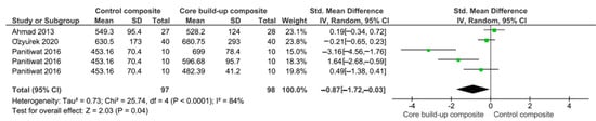 The meta-analysis suggested that the fracture strength of endodontically treated teeth was statistically significantly higher than the control when a core build-up composite was used (p = 0.04) (Figure 2).