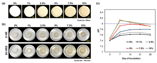 Characterization of CS/PEG CPC. (a) Image of CS/PEG on the CPC with five different concentrations of CS/PEG. All CS/PEG CPC samples were tested at 0 and 24 h of incubation in PBS. (b) Image of CS/PEG CPC samples. (c) Change in pH of CS/PEG CPC with time (incubated at 37 °C for 28 days; PBS was changed every three days).