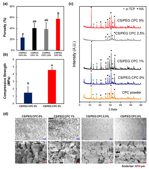 Physical properties of CS/PEG CPC. (a) Overall porosity of CS/PEG CPC. (b) The mechanical properties of the CS/PEG CPC were analyzed using a texture analyzer. (c) X-ray diffraction patterns of the CPC powder and CS/PEG CPC identify the crystalline phases in the material and thereby reveal the chemical composition. The positions of the referenced peaks of HA (JCPD No. 9-432) are indicated. (d) Scanning electron microscope (SEM) images of surface morphology of CS/PEG CPC that were hardened for 3 days (n = 5, ANOVA, Duncan’s multiple range test, p < 0.05). Same letters indicate that there is no significant difference between samples.