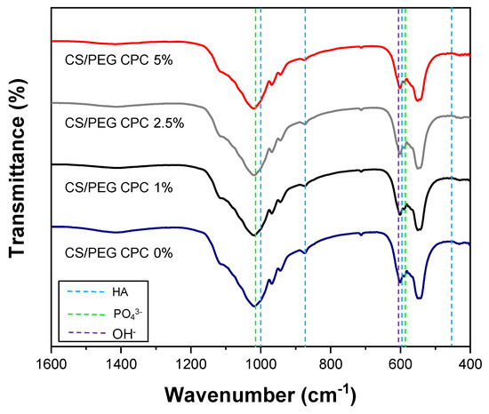 Fourier transform infrared (FT–IR) spectra of CS/PEG CPC was recorded for the hydroxyl group (625 cm−1) and the phosphate groups (1112, 1030, 960, 605, and 563 cm−1) [34,35].