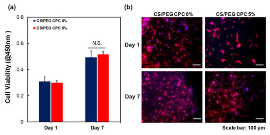 To analyze the cell viability, the WST-1 assay was performed using the DPSCs. The cells were cultured on the 0% and 5% CS/PEG CPC for seven days and exhibited an increase in cell proliferation; however, there was no significant difference in the cell viability between the 0% and 5% CS/PEG CPC (Figure 4a). In Figure 4b, the morphologies of the DPSCs on the CPC by immunocytochemistry (ICC) after seven days of culture. F-actin (red) and DAPI (blue) indicate the cytoskeleton and nucleus, respectively. It can be seen that the DPSCs are well-attached to the CS/PEG CPC. The images also show that the CS/PEG CPC exhibits good cell adhesion and biocompatibility.