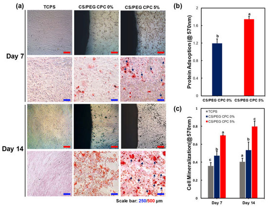 Mineralization by CS/PEG CPC surrounding microenvironment analyzed by ARS staining. DPSCs were cultured on the 0% and 5% CS/PEC CPC, with tissue-cultured polystyrene (TCPS) as the control. (a) Image of the cells cultured for 7 and 14 days in osteogenic differentiation media: the calcium nodules exhibit denser and darker (red) staining with increasing culture time. The calcium nodule formation is indicated (blue arrow). (b) BSA protein absorption of 0% and 5% CS/PEG CPC after incubation for one day (n = 5, ANOVA, Duncan’s multiple range test, p < 0.05). (c) Quantification of calcium nodules by ARS staining. Different letters indicate significant differences between groups (n = 5, ANOVA, Duncan’s multiple range test, p < 0.05).