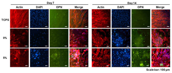 To confirm the expression of the osteogenic markers of the DPSCs on the CS/PEG CPC, the DPSCs were seeded on a 96-well plate (2 × 103 cells/well) with different concentration ratios of CS/PEG CPC samples (0% and 5%) and incubated for 24 h in a humidified CO2 incubator. Subsequently, the DPSCs were substituted with osteogenic differentiation conditioned media on days 7 and 14. Afterward, the cells on the CS/PEG CPC were fixed with a 4% paraformaldehyde solution (Sigma-Aldrich, St. Louis, MO, USA) for 30 min at room temperature. The samples were treated with 0.2% Triton X-100 (Sigma-Aldrich, St. Louis, MO, USA) for 15 min, and then stained with TRITC-conjugated phalloidin (Millipore, Burlington, MA, USA) for 1 h and 4’,6-diamidino-2-phenylindole (DAPI;Millipore, Burlington, MA, USA ) for 5 min. The osteopontin (OPN) protein was stained with monoclonal anti-OPN antibody (1:500, Abcam, Cambridge, MA, USA) and FITC-conjugated goat anti-human antibody for 1 h. A Nikon fluorescence microscope was used to acquire images of the stained cells. Quantitation analysis of expression of OPN was carried out using ImageJ software (NIH, Bethesda, MD, USA).