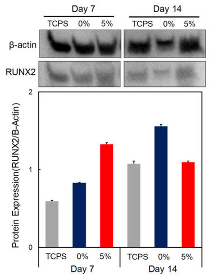 The Western blot analysis to investigate the effects of the osteogenic differentiation of DPSCs cultured on the 0% and 5% CS/PEG CPC is shown in Figure 7. A comparison of the CS/PEG CPC with the control group (TCPS) and the 5% CS/PEG CPC showed higher gene expression levels of the osteo-progenitor marker Runx2 at day 7, but the value decreased at day 14.