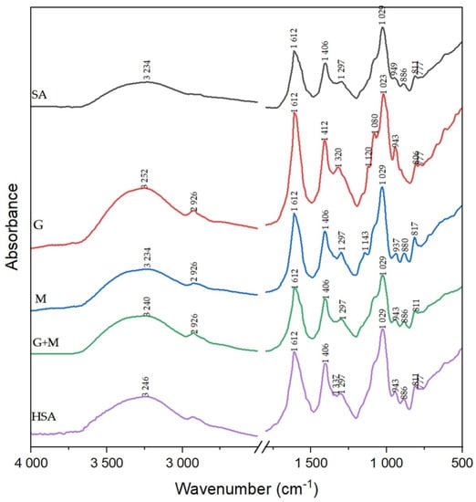 Spectroscopic analysis was performed to confirm if alginate changed after the depolymerization processes, and the results are presented in Figure 2. The transmittance peaks of sodium alginate, which appear at 3234, 1612 and 1086 cm−1, are attributed to hydroxyl, C–O–O−, and C–O–C groups, respectively. The carboxyl groups do not change after degradation, which is why the peak at 1612 cm−1 for SA was taken as the reference one. Some weak bands at 1297cm−1 may be due to C–C–H and O–C–H deformation, and the band at 1029 cm−1 may be also assigned to C–O stretching vibrations. The increase in the absorption band around 2926 ± 20 and 2840 ± 20 cm−1 could be due to new chain ends, in correlation with the bands in the fingerprint region around 1430 and 1370 cm−1 [27]. The partially degraded alginates: G, M, G + M, HSA present different characteristics in the fingerprint region (1200–750 cm−1). The decrease in the peak ratio of the C–O–C group compared to the reference one was observed. According to Mao et al. when glycosidic bonds are breakage, the decrease in the ratio may be seen after H2O2 treatment [25]. The absorption ratios A1086/A1612 were: 0.8869, 0.8044, 0.8052, 0.8365 and 0.8576 for SA, G, M, G + M and HSA, respectively. It was proved that MW is in linear correlation with the absorption ratio A1086/A1612 [25]. The spectrum of G + M and M look similar to the SA but changed slightly in the fingerprint region. The C–O stretching vibration of the carboxylate group is moved to 937 cm–1 compared to G + M and SA. The spectrum of the G fraction presents the C–O stretching vibration at 943 cm–1. Absorption peaks at 806 and 777 cm–1 are attributed to deformation vibrations of COH, CCH and OCH moieties in the a-L-guluronic acid residues, with contributions of the bending deformation vibration of the C–O–C glycosidic linkage in homopolymeric blocks [28]. The HSA spectrum showed additional bands at 1337 and 777 cm−1, which are assigned to the skeletal vibration and deformation vibration, respectively.