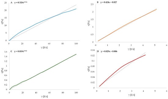 where τ—shear stress (Pa), k—consistency index (Pa· s), γ—shear rate (s −1), n—flow behavior index (–), ηα—apparent viscosity (mPa·s).