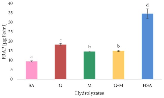Ferric reducing antioxidant power of acidic (G, M and M + G) and oxidation (HSA) depolymerization products of sodium alginate-control (SA). Results are expressed as the mean ± standard error. Values with different letters (a–d) within the same column differ significantly (p < 0.05).