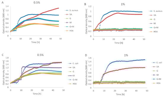 The antimicrobial effect was tested by the broth microdilution method against Escherichia coli (PCM 2560) and Staphylococcus aureus (PCM 2602). The microorganism strains were obtained from the culture collections of the Institute of Immunology and Experimental Therapy (Polish Academy of Sciences in Wroclaw). The method was performed as described previously by Alqahtani et al. [19] with modifications. The microorganisms were grown on Mueller–Hinton Broth (MHB) (Merck, Poznań, Poland) for 18 h at 37 °C and adjusted to 1 on the McFarland standard. Then, 10 µL of the bacterial broth suspension was inoculated into each well containing 10 µL of SA, M, G, M=G and HSA in 230 µL of MHB and again incubated for 18 h at 37 °C. Bacterial growth was measured every 0.5 h using a microplate reader (Bioscreen C, Growth Curves USA, Piscataway, NJ, USA) set at an optical density (OD) of 600 nm for 48 h.