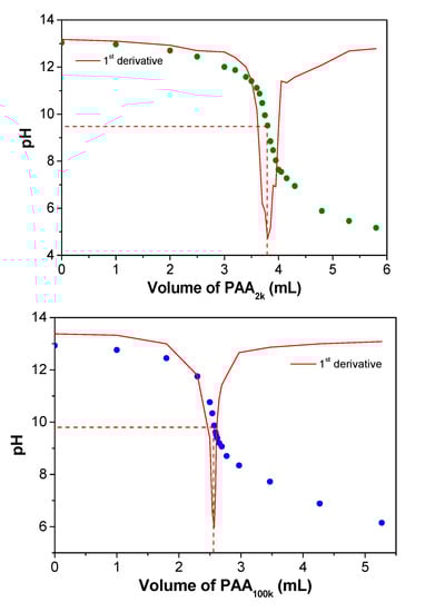 After ion exchange, 20 mL of the PDADMAOH solution is then titrated with PA2k or PA100k (0.35 mol L−1 in repeat units) by using the titrator model 848 Titrino plus from Metrohm (Herisau, Switzerland), equipped with a pH electrode model 6.0262.100. Coacervation takes place according to the acid–base reaction, described in Equation (1) with resulting titration curves shown in Figure 1. Then, PAA solution is added to the remaining PDADMAOH solution until achievement of the pH of the equivalence point. At this point, the charge stoichiometry is taken as 1:1. The resulting coacervate is left with its supernatant for at least 24 h. Then, the supernatant is removed and the coacervate is collected and centrifuged to better separate it from the residual supernatant. The complexes were named PDADMAPAx, where x can be 2k or 100k, depending on the molar mass of PA−.
