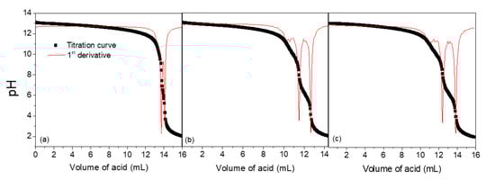 Titration curves of 20 mL of PDADMAOH solutions with 0.1 mol L−1 HCl solutions (a) immediately; (b) 24 h and (c) 48 h after their removal from the ion-exchange resin.
