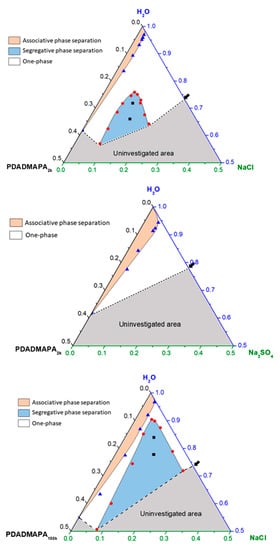 The following are available online at https://www.mdpi.com/article/10.3390/polym13142259/s1, Figure S1: pH titration curve of a poly(acrylate) solution with HCl solution, Figure S2: Thermogravimetric analysis of the upper phase of a mixture containing PDADMAPA2k, water and NaCl, Figure S3: Thermogravimetric analysis of the separated solutions of the polyelectrolytes used in this work under nitrogen atmosphere, Figure S4: Pseudo-ternary phase diagrams of mixtures containing PDADMAPA100k, water and salts assessed as an attempt to verify the occurrence of segregative phase separation, Table S1: Phase composition for the mixtures of NaCl, water and PDADMAPA in the segregative phase separation region.