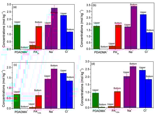 The idea of polymer segregation at high salt concentrations comes from similar observations for systems containing polyelectrolytes and oppositely charged surfactants [27,35,36,37], and at least one system containing oppositely charged polyelectrolytes [38]. A more detailed investigation of this region was performed by analyzing the chemical composition in two systems for each PDADMAPA (see Figure 3). The concentrations of the ionic species are exhibited in Figure 5, and Table S1 in the Supporting Information presents a complete description of these systems. Both phases present a water content in the range of 65–82 wt %, meaning that these samples behave as aqueous two-phase systems essentially. Figure 5 and Table S1 also show that PDADMA+ concentrates entirely in the upper phase according to the analyses performed by TGA and mass balance. PA−, on the other hand, concentrates mostly in the bottom phase with a residual concentration in the upper phase. A previous study also reported the segregation between PA− and the cationic surfactant dodecyltrimethylammonium aggregates at high salt concentrations [27]. That study showed that the surfactant is highly concentrated in the upper phase while the polyanion can be more concentrated in the bottom phase provided its molar mass is large enough. Those and the present results are qualitatively similar, confirming that the mixing between oppositely charged colloids tends to induce segregation at high salt concentrations. In addition, results in Figure 5 reveal that not only the poly-ions, but also the small ions display a significant segregation between the phases. Each small ion concentrates more in the phase enriched with its respective oppositely charged poly-ion.