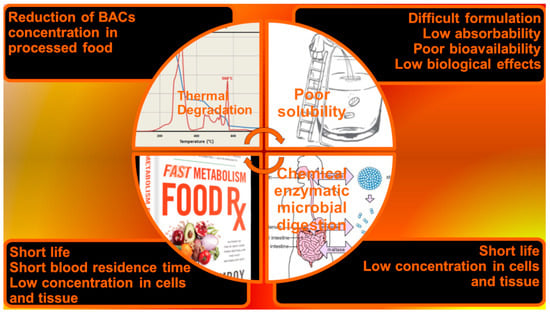In this regard, note that industrially processed foods contain fewer healthy compounds than fresh or frozen foods, due to degradation reactions that can occur during extraction or thermal decomposition procedures that can take place during heat treatments such as cooking [7,8,9]. To address this problem, an interesting solution for increasing the concentration of bioactive compounds could be to incorporate isolated BACs into commercial food products, obtaining BAC-enriched FF. An alternative strategy for pursuing the daily ingestion of an effective dose of BACs could be to formulate BACs in pharmaceutical-like preparations, such as FSs, which can be taken in addition to the normal diet. Unfortunately, the poor stability of BACs and the low solubility rate severely limit the feasibility of both resolutions [10,11,12]. Furthermore, the possibility of exploiting extracted BACs as effective orally administrable promoters of health is almost utopic. Note that for any bioactive molecule, solubility in an aqueous environment, permeability across the membrane of epithelial cells, and molecular interactions in the gastrointestinal tract (GIT) fluids are pivotal factors that strongly influence its path to the bloodstream, its final distribution to the targets, and therefore its effectiveness. Unfortunately, most BACs are insoluble in water and, in whatever form they are introduced orally, if not properly manufactured, they rarely reach the site of action in therapeutic concentrations. Moreover, degradation by chemical digestion, both enzymatic and microbial, which occurs in the mouth, stomach, and small and large intestine [6], further reduces the therapeutic effects possessed by BACs. Furthermore, even if a small fraction of BACs and their active metabolites manage to reach the bloodstream, they frequently undergo fast metabolism and are rapidly excreted via the kidney, biliary, or lung [13]. Collectively, BACs achieve only nano/picomolar concentrations in cells and tissues, which are insignificant doses for producing a health promotion response. Figure 1 exhibits the main criticisms and events that limit the beneficial effects of BACs after oral administration.