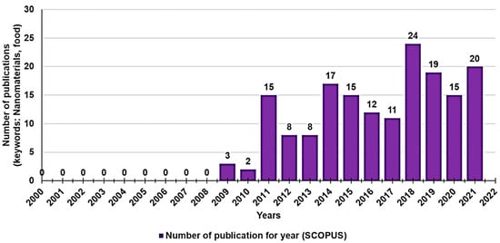 To give readers an idea of the growing scientific interest in the application of nanotechnologies in the food sector in the last 20 years, we carried out a survey of the number of works published year by year from 2000 to today, doing a search by keyword (nanomaterials, food) in Scopus (Figure 2).