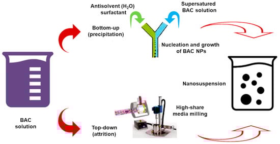 Nanosuspensions (NSs) technology is a technique suitable to improve solubility and bioavailability both of hydrophilic (H) and lipophilic (L) bioactive compounds (HBACs and LBACs). An NS is a colloidal dispersion of NPs in an aqueous media, stabilized by surfactants, co-surfactants, and polymers [15]. BACs NPs achieved by NSs techniques possess high dispersibility and solubility. They are exploitable for a sustained, controlled, and targeted delivery of the loaded BAC and possess improved stability and therapeutic effects in cells and tissues [60]. The conventional approaches to prepare NSs consist of the bottom-up and top-down methods (Figure 4).