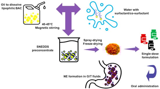 SEDDSs are suitable for orally delivering LBACs, food-grade chemicals additives, and, more in general, drugs. SEDDSs are anhydrous nano-dispersions achieved by drying a mixture of an oil phase, surfactants, co-surfactants/co-solvents, and LBACs through proper procedures, including SD or FD [65]. These powders will spontaneously arrange in colloidal EMs when merged with water or with GIT fluids [76]. SEDDSs include Self-Nanoemulsifying Drug Delivery Systems (SNEDDSs) (droplets size < 50 nm) and Self-Micro-emulsifying Drug Delivery Systems (SMEDDSs) (droplets size of 100–200 nm) [15]. SEDDSs can be taken orally by either solubilizing them in water and drinking the obtained NE or by ingesting capsules filled with gelatin (Figure 5).