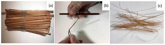 As illustrated in Figure 1, stems of the guaruman plant were purchased in a local market in the city of Belem, state of Para, in the north of Brazil. Splints were mechanically cut from each stem, as shown in Figure 1a. Guaruman fibers were carefully separated from each splint with a surgical blade (Figure 1b). Figure 1c presents the guaruman fibers as a bundle prior to their application as reinforcement for polymer matrix composites.