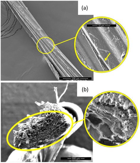 Another noteworthy point can be observed in Figure 6; in this figure, one may observe the delamination between fiber and matrix, as observed in Figure 6a. However, it is also important to note the high number of voids and pores—as shown with high magnification in Figure 6b—that are inherent to the guaruman fiber. Such high pore content can be directly associated with the low density calculated for this fiber [22]. This could be considered a remarkable advantage of the use of the guaruman fiber in comparison to many other NLFs as reinforcement for polymer matrix composites, as will be further discussed.