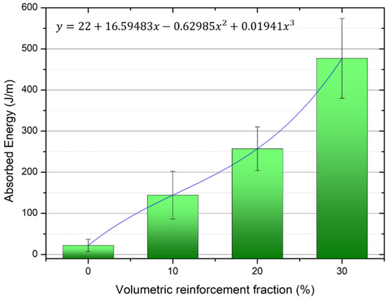 Figure 3 shows the variation in the absorbed energy, associated with the impact resistance, as a function of the volume fraction of guaruman fiber incorporated into the epoxy composite. In this figure, one may notice a significant increase in the impact energy absorption; such an increment of resistance may be approximated by a third-degree polynomial function, as noted. Another point worth mentioning is that an energy absorption 20 times higher than those measured for the neat epoxy condition [22] was obtained for the 30 vol% guaruman fiber composites.