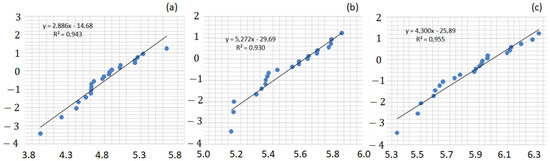 Weibull frequency distribution graph for the epoxy composites with different volume fractions of guaruman fiber: (a) 10, (b) 20, and (c) 30 vol%.