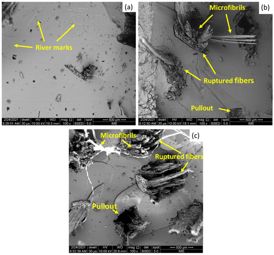 One may notice in Figure 5a the brittle characteristics exhibited by the composite with the lowest amount of fiber reinforcement (10 vol% of guaruman fiber), which may be associated with the ineffective degree of reinforcement. In this case, the brittleness of the epoxy matrix can be held responsible as the main mechanism of failure of this composite. This behavior is evidenced by the appearance of river marks in the epoxy matrix. Similar behavior was reported by Garcia Filho et al. [18] for an epoxy matrix composite reinforced with piassava fibers under high-strain-rate conditions, especially for composites with a lower volume percentage of fiber reinforcement.