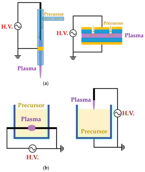 Representative configuration of (a) gas/aerosol-through-plasma (GATP) methods (left: jet type, right: dielectric-barrier discharge (DBD) type) and (b) solution plasma methods (left: in-solution plasma, right: on-solution plasma).