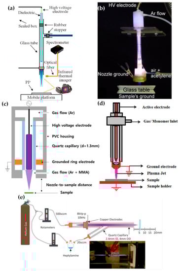 Zhang et al. [51], Ricci Castro et al. [52], Van Vrekhem et al. [53], and Pandiyaraj et al. [54] reported an APPJ with pin–ring electrodes. The pin electrode and the ring electrode are used as high-voltage (HV) and ground electrodes, respectively. Zhang et al. reported an APPJ for poly(methyl methacrylate) (PMMA) coating on a bumpy surface. This APPJ consists of a T-shaped quartz glass body and pin–ring electrodes; the pin electrode is a copper (Cu) rod covered with a quartz glass tube (Figure 2a). Both the plasma discharge gas and monomer bubbler gas are argon (Ar). In this method, the methyl methacrylate (MMA) monomer liquid is housed in a bottle within an oil bath held at 40 °C, and is bubbled with Ar gas introduced through the branch of the quartz body in an aerosol state. The power generation uses an alternating current (AC) source from 10 kHz to 60 kHz with a maximum voltage of 17 kV supplied through the pin electrode [51].