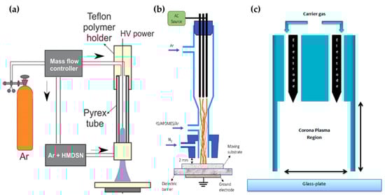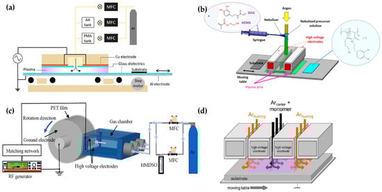 Mertens et al. employed two electrodes covered with different dielectric materials for hydrophilic and hydrophobic coatings for about 11 substances. The upper Cu electrode (powered electrode) and the lower Cu electrode (grounded electrode) were covered by a 3-mm-thick α-alumina and a 2-mm-thick borosilicate, respectively. The gap between the two electrodes was 4 mm. This plasma generation system was placed in a Pyrex glass cylinder chamber. The inside of the chamber was pumped down to 270 Pa and filled to atmospheric pressure with Ar. The precursor bubbled by a secondary flow was introduced into the plasma region by diluting it with the primary flow (Figure 6b) [71].